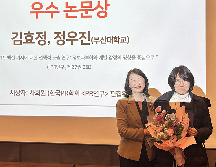 미디어커뮤니케이션학과 김효정 교수와 심리학과 정우진 박사수료생은 ‘제11회 한국PR학회 학술상 우수 논문상’을 수상했다.